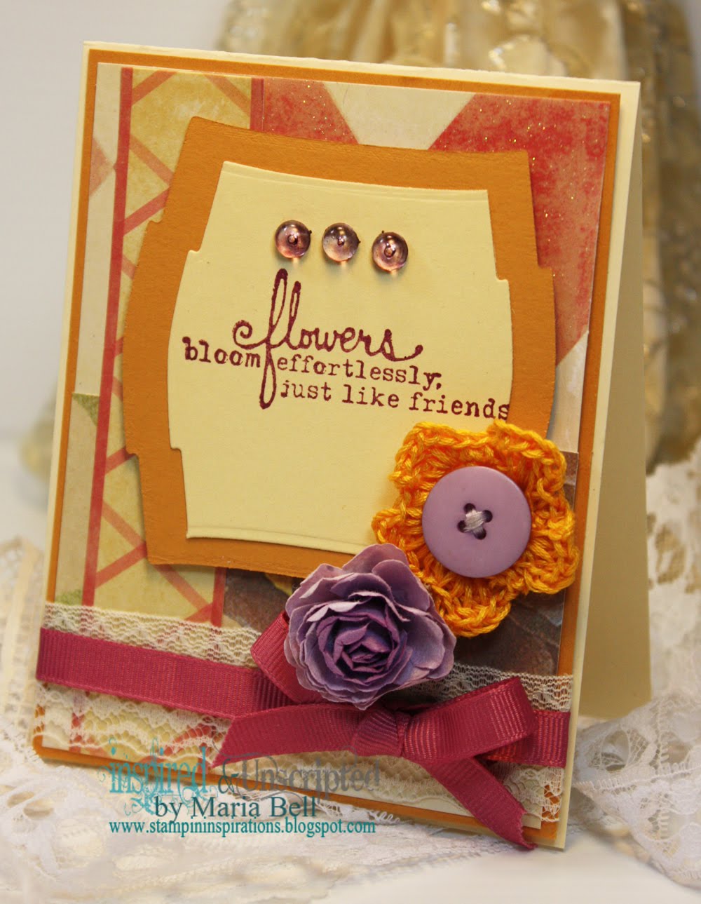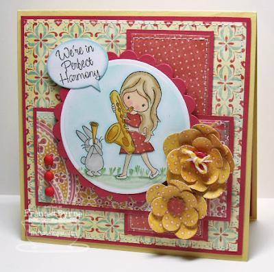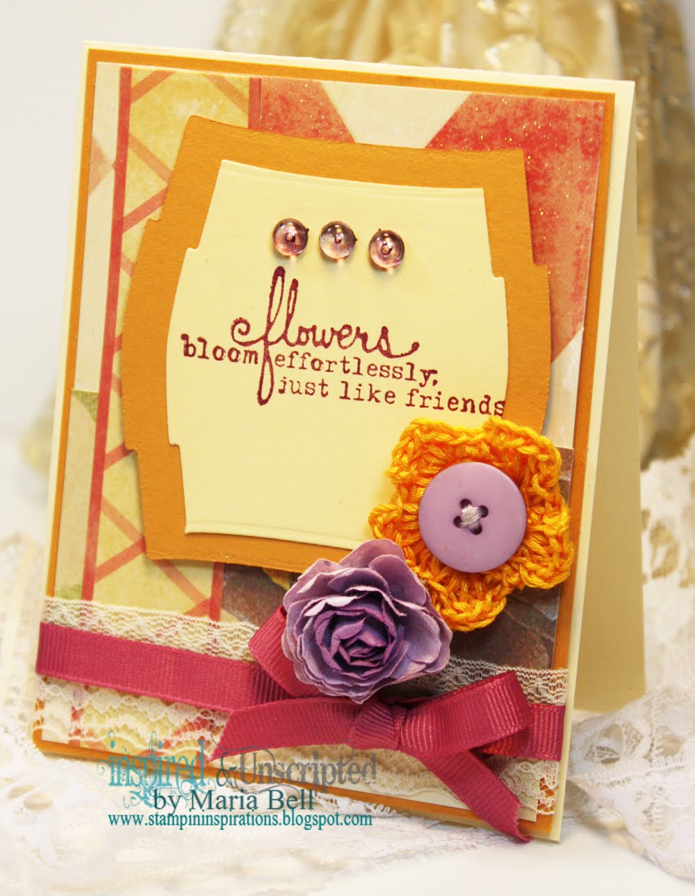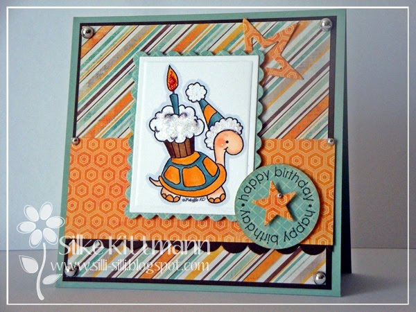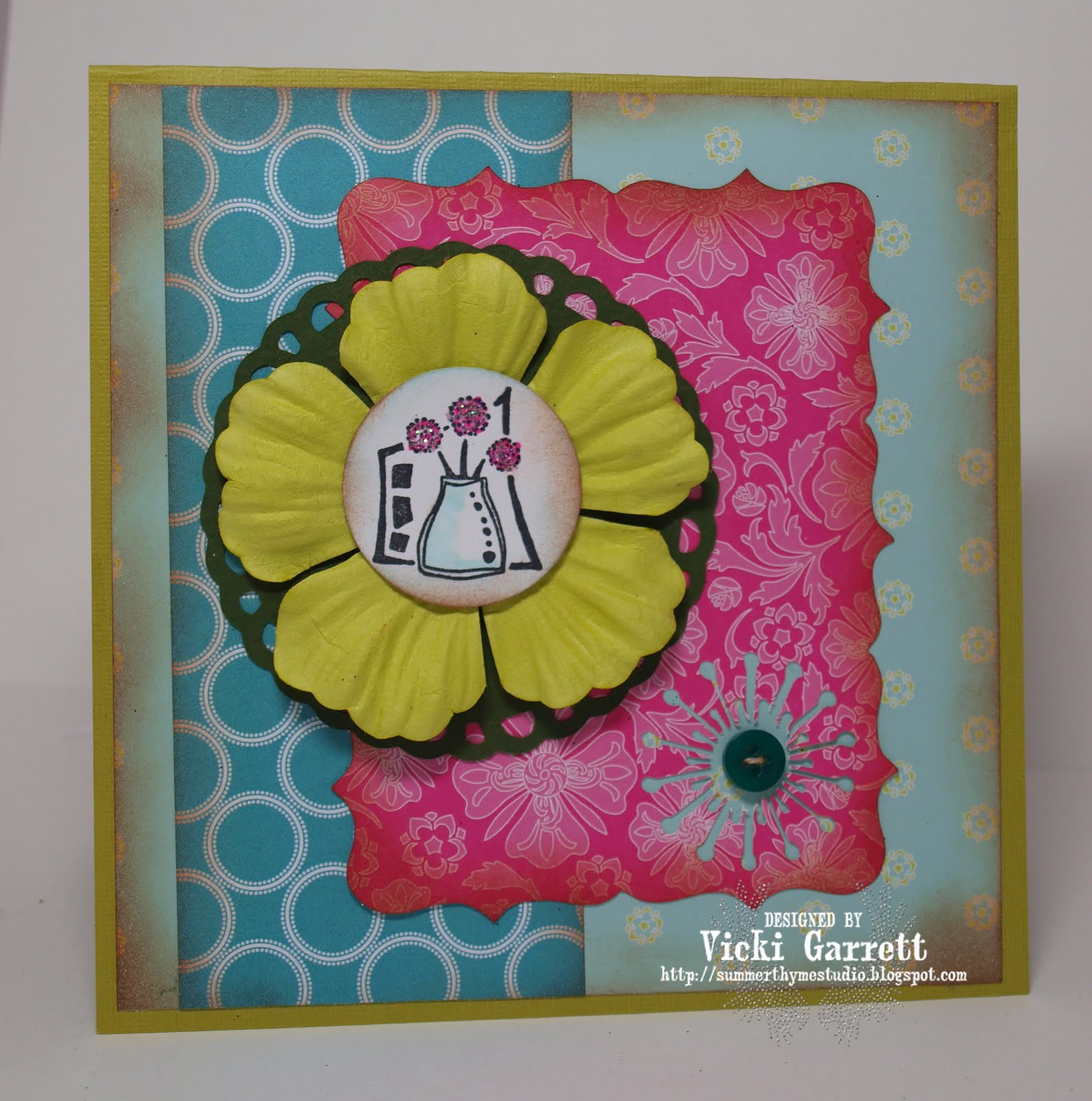 Our challenge hostess Silke Kittman brings her last challenge for the month to us all. She has given us all a recipe to work with this week. The recipe is for us to use 3 different designer papers; 2 flowers and 1 button.